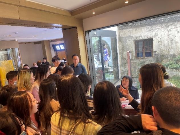 最后,同学们来到绣娘丝绸(山塘店)进行企业参观。企业负责人以“绣娘丝绸”为例,从商业的角度出发,向同学们分享了一个成功产品需要具备的要素。第一个要素是要对用户有清晰的定位。根据不同的用户群体将旗下产品分为不同板块,使每一个产品都能满足相应用户的喜好,让每一种产品都呈现出唯一性、独一性和差异性。第二个要素是打造自己的IP形象。这就需要产品不仅要结合、完善好本身的文化优势,也要结合新的技术手段进行创新。第三个要素是将传统技艺与文化融入到产品之中,主讲人用“绣娘丝绸”的云锦和宋锦举例,展示了这两种产品的工艺差别以及各自的文化内涵,这种文化与产品的融合设计不仅仅只是模仿传统技艺的样式并将其照搬过来,而是要学习传统技艺中蕴含的文化含义,再结合市场与用户的喜好进行不断的改良,才能使产品更具有竞争力。