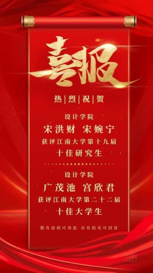 近日,江南大学第二十二届“十佳大学生”、第十九届“十佳研究生”评选活动决赛在北区大学生活动中心音乐厅举行。我院广茂池、宫欣君同学荣获“十佳大学生”荣誉称号;宋洪财、宋婉宁同学获得“十佳研究生”荣誉称号。