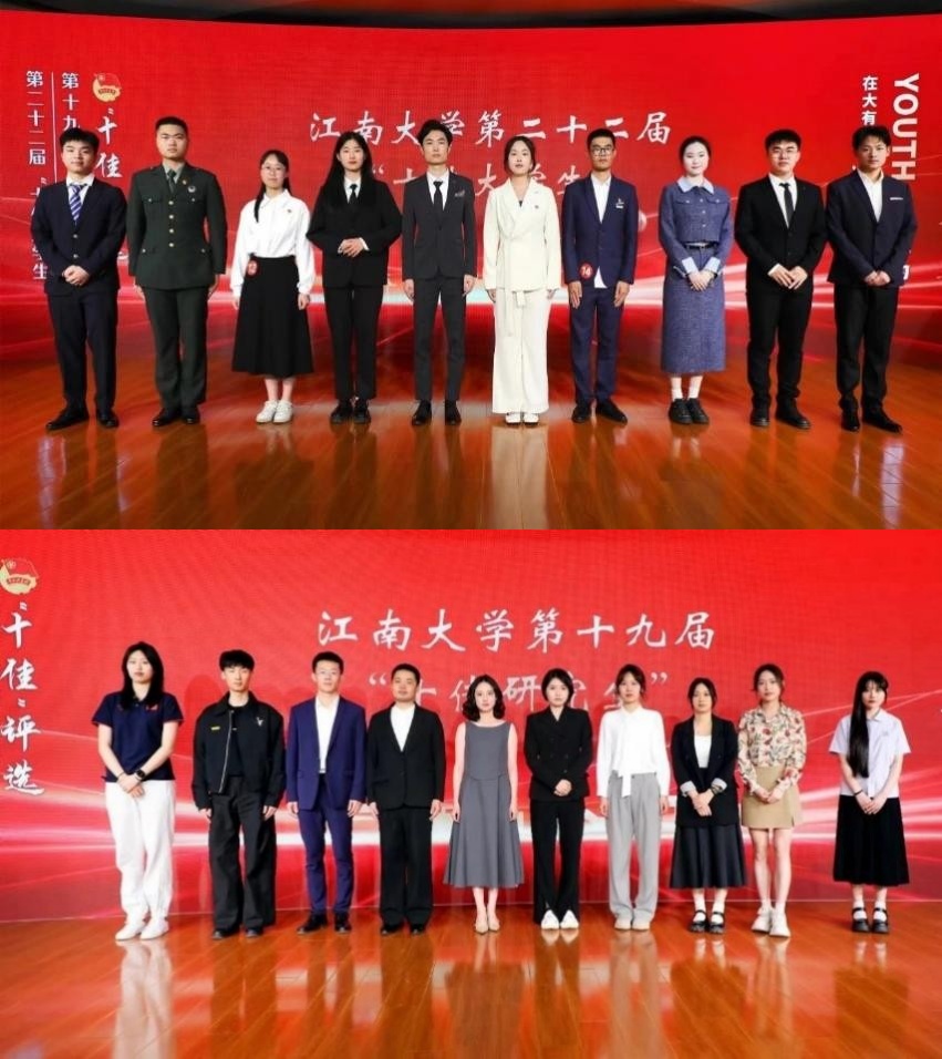 江南大学“十佳大学生""十佳研究生“评选活动是学校选树学生先进典型的品牌活动。本次活动遴选出的“十佳”学子们身体力行,深刻践行了"笃学尚行,止于至善”的江大校训,展现了有理想、敢担当、能吃苦、肯奋斗的新时代好青年的风采。