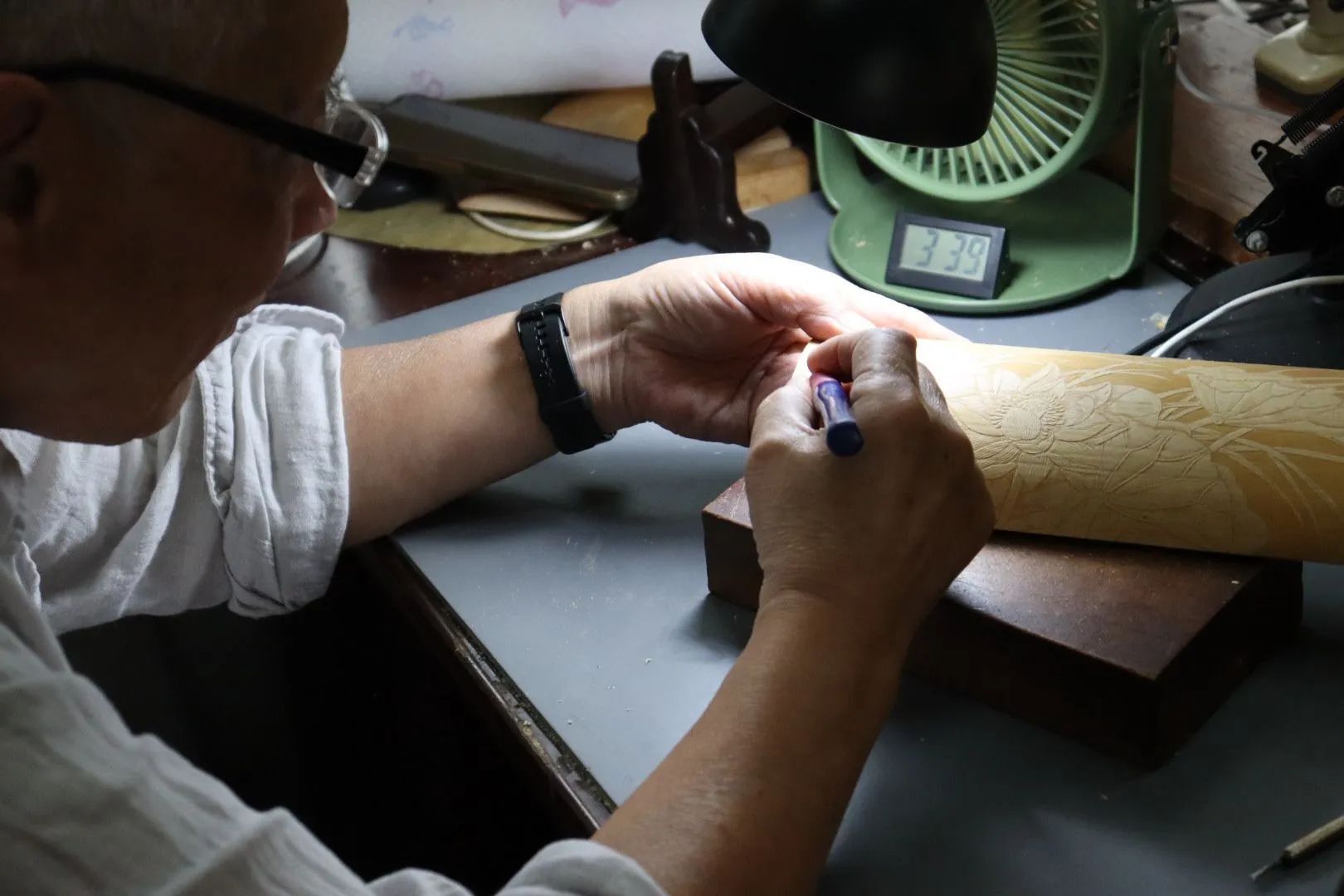 无锡竹刻为家传手艺,我们采访到了竹刻传承人乔锦洪先生。“我们工艺美术界把留青竹刻叫做留青浮雕。其实就是在浮雕中间很微妙的局部刻意留一点竹子的青皮,那个韵味就会变得很独特,不是单纯去雕刻竹子。”竹刻里不仅有风抚佳荷,还有松柏青青。刻下诗句,如古人提案在此,句句振声;刻下花草,如春日悄然临近,万类苏生。竹刻于19世纪正式在中国成为艺术的一种,晚清有诗云:“此艺在人间,千秋渺馀子。”“第一步是构图,就像工笔画里的白描,用线条把刀刻的部分全部定下来。第二步叫铲底,便是用平口刀去除不要的部分。第三步平整坑洼的地方,再下一步便是用刀尖分出图案的前后层次。”先生说。“这一步叫分韵。竹子的青皮既是韵母,深浅厚薄,皆由心而定。图像的质感因此而生”“第五步便是整修,便是回头检查前面的步骤是否到位,查缺补漏。最后再上一点油。古人用桐油,我们现在用核桃油,去把整个作品滋润一下,图案便更加突出。”