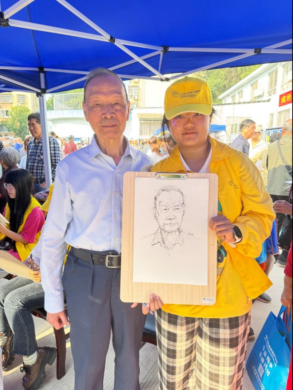 学生龚博文分享道:“画画像的时候主要是要抓型,把握住老人的外貌特征。正是因为我的造型能力还可以,老人看到我的画都很满意。我觉得能让这些老人感到开心是件很幸福的事。”在这个特殊的日子里,设院学子共同携手,用实际行动传递爱与温暖,给老同志们留下美好的回忆。