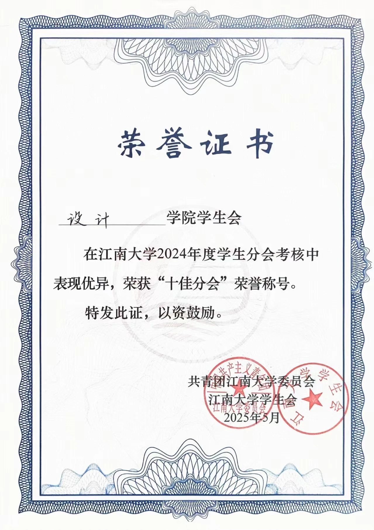 非凡娱乐 学生会荣获江南大学2024年度“十佳分会”荣誉称号。