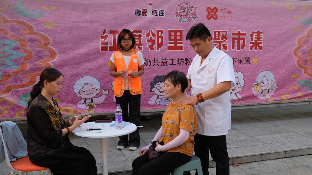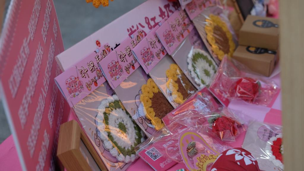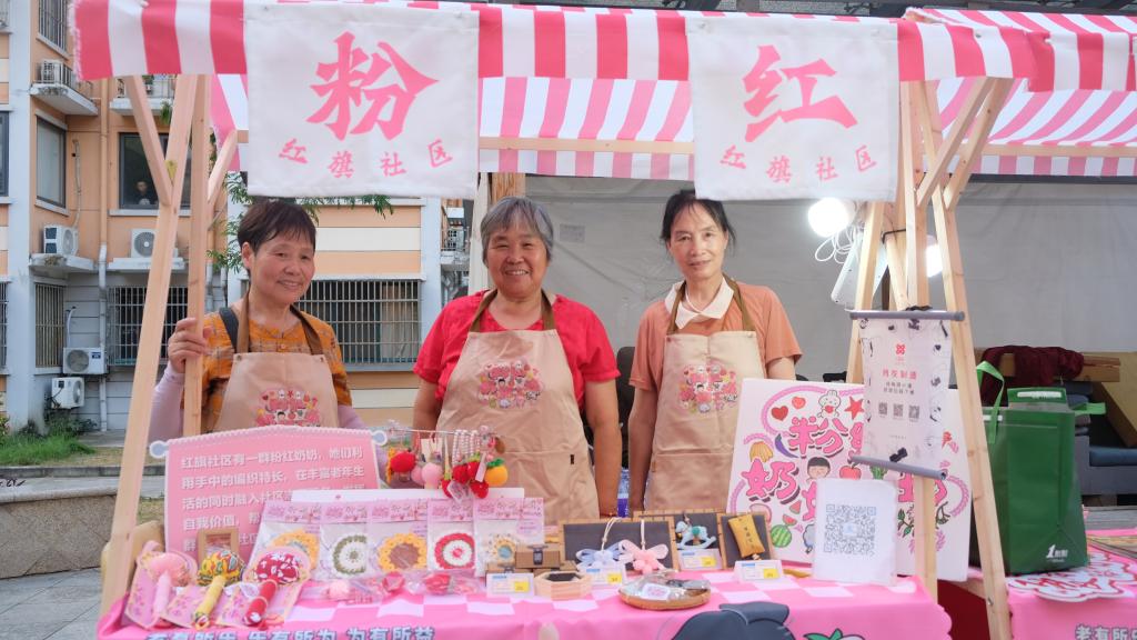 夕阳西下,六个摊位在广场上依次亮起,晚风轻拂,吹动着摊位上精巧的手工艺品。这些作品出自社区粉红奶奶们之手,而精美的包装设计则来自非凡电子娱乐平台