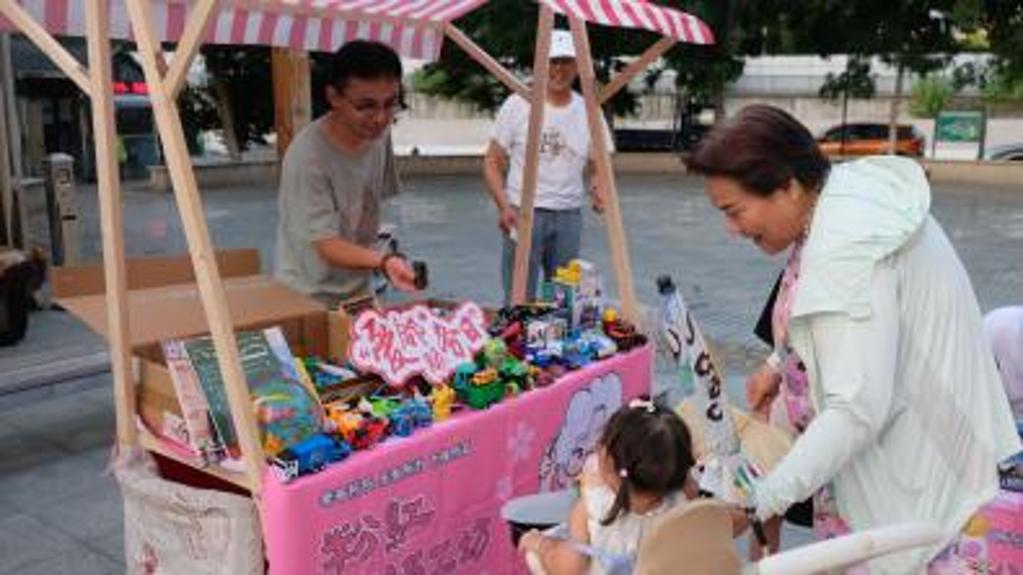 本次粉红益集不仅展示了奶奶们的手工制品,还特别设置了社区的闲置物品交换摊位。小朋友们也在家长的陪伴下,当起了"夜市小掌柜",大声吆喝,认真地向顾客介绍自己的闲置玩具和书籍。在这里,孩子们不仅学会了交易,更懂得了分享的意义——不少小朋友主动拿出自己心爱的玩具,与其他小摊主以物易物,在交换中收获双倍快乐。