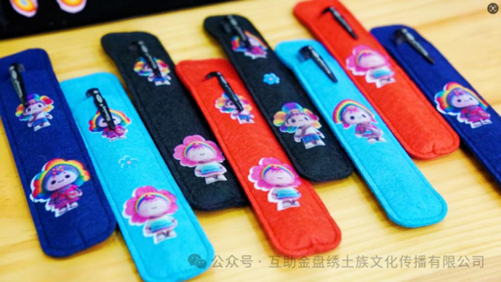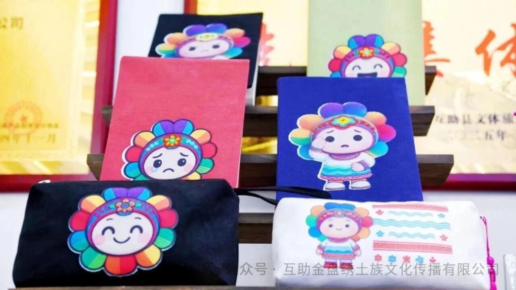 陈香副教授团队深入挖掘土族文化与盘绣工艺精髓,为基地量身打造全新形象IP“虹珞珞”——该形象以彩虹与盘绣太阳花为核心设计符号,结合太阳花的土语“廓日洛”,寓意“彩虹之乡·绣线传承”,兼具现代审美与民族韵味。依托这一IP,公司团队进一步开发出腕带、包包、钥匙扣、首饰、书衣等系列文创产品,有效提升盘绣产品的设计感与市场吸引力,实现传统文化与现代消费需求的精准对接,为国家级非物质文化遗产土族盘绣注入高校智慧与现代设计力量。