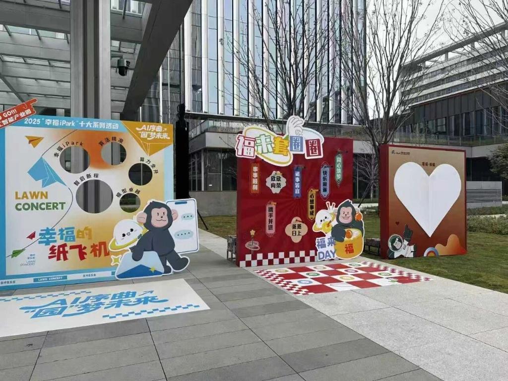 吴祐昕教授团队始终从园区长远发展需求出发,以系统化设计思维为无锡(国家)软件园打造专属 IP 与主题曲 MV,构建起“可视化 + 可感知 + 可传播”的品牌生态体系,充分彰显学院“设计服务产业长远发展”的专业能力。团队为园区量身设计的专属 IP,并非局限于“一次性活动设计”,而是覆盖“全场景、全周期”的品牌载体。在开园活动现场,IP 元素从视觉标识、场景装饰,到延展物料、互动装置实现“全渗透”,将园区“幸福 iPark”的核心理念转化为鲜活、统一的视觉形象,瞬间提升园区的辨识度与品牌亲和力;这种“立足长远、服务发展”的设计思路,让设计成为推动园区文化建设、品牌传播的 “软实力”。