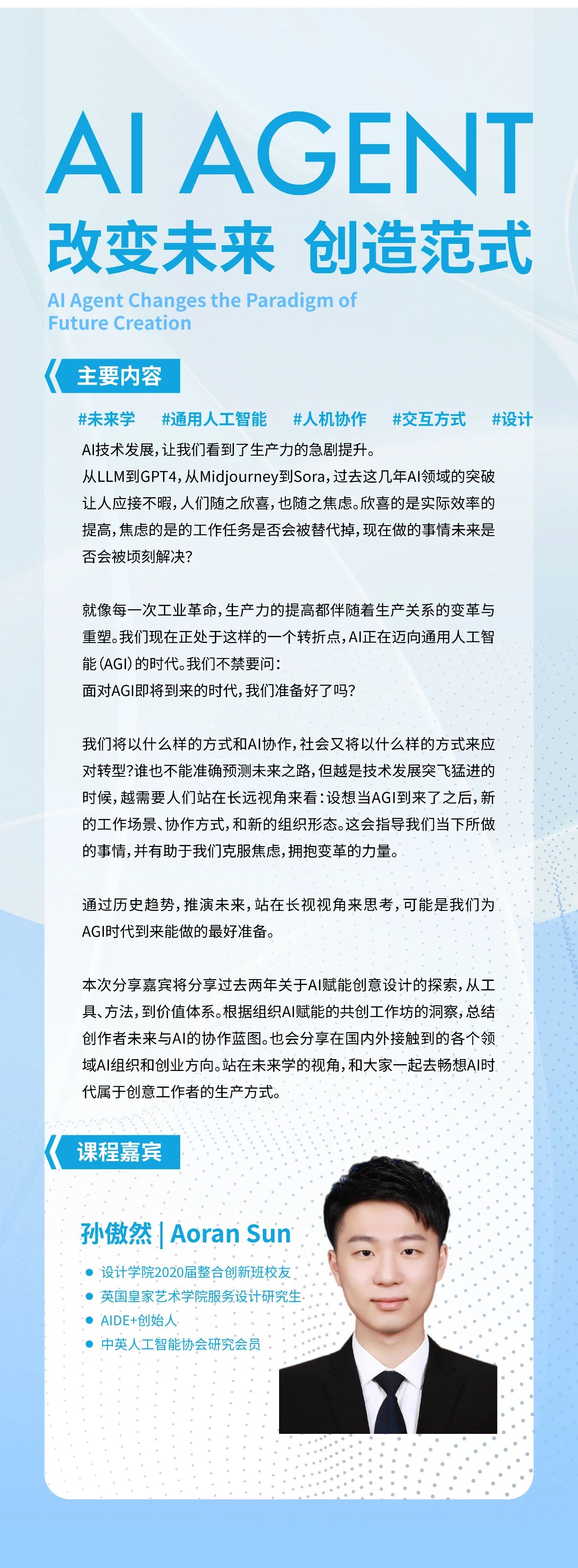 2020 届整合创新班优秀校友孙傲然(Aoran Sun) 作为主讲嘉宾,围绕人工智能、人机协作、设计创新等话题,分享他在行业前沿的探索与实践经验,带领大家思考AI时代下的创新机遇与挑战。