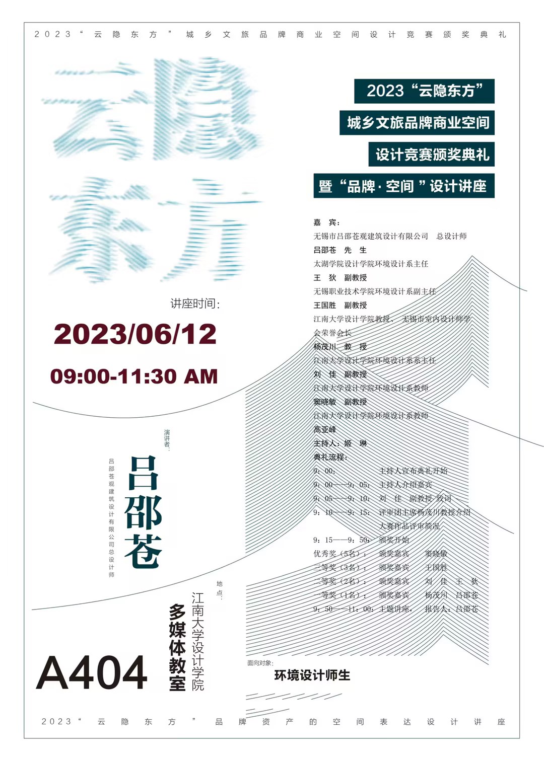 环境设计系教师 高亚峰 主持人:姬 琳典礼流程:9:00: 典礼开始9:00——9:05:主持人介绍嘉宾9:05——9:10:刘 佳 副教授 致词9:10——9:15:评审团主席杨茂川教授介绍大赛作品评审简况9:15——9:50:颁奖开始 优秀奖(5名): 颁奖嘉宾 窦小敏三等奖(3名): 颁奖嘉宾 王国胜 二等奖(2名): 颁奖嘉宾 刘 佳 王 狄一等奖(1名): 颁奖嘉宾 杨茂川 吕邵苍 9:50——11:00:“品牌.空间”主题讲座,报告人:吕邵苍