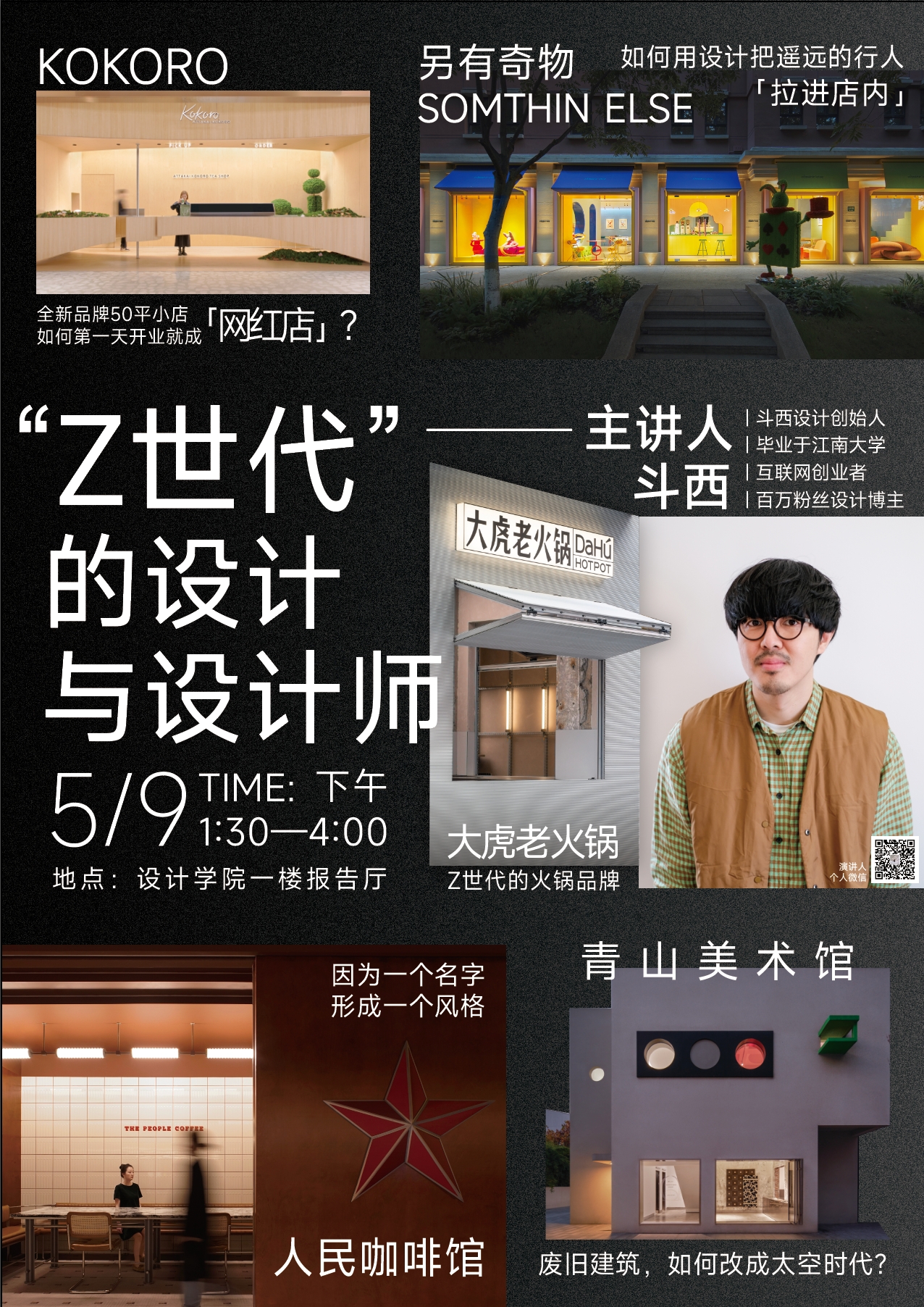 讲座内容简介:斗西设计作为国内一线新餐饮、新零售、新体验空间设计团队,在过去10年间做了众多在年轻人群体中红极一时的设计,这是创始人斗西首次高校演讲,作为国内专注Z世代新零售的空间的设计师,斗西会通过5个精彩的成功商业空间案例,咖啡,零售店,艺术馆等,让设计师们深入了解「商业设计」背后的巨大价值。同时,也将为年轻设计师指引方向,洞悉设计的未来趋势,让大家知道在这个时代应关注哪些设计。