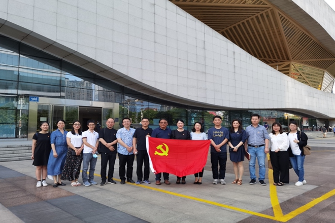 一行人首先参观了“肩负民族复兴期望的无锡人”专题展区,聆听了包括陆定一、秦邦宪、王选、荣毅仁等在内的13位在民族复兴大业中做出卓越贡献的无锡籍仁人志士的革命史、奋斗史,通过一件件历史文物和一个个生动的故事,深切感怀了先辈们为祖国、为民族发展奋发图强的奋斗精神和为国为民不惜牺牲一切的坚定品格。随后,一行人透过“血与火的城市记忆——无锡革命简史”专题展区,了解了无锡人民在中国共产党领导下进行新民主主义革命的艰难曲折历程,和从五四运动直至无锡解放的壮丽历史画卷。在鲜红的党旗下,全体人员在党委书记邱建平带领下,重温了入党誓词,坚定入党初心。
