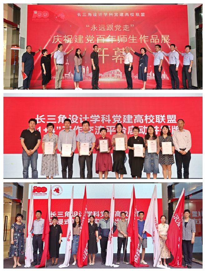 联合东华大学、上海交通大学、同济大学、南京艺术学院、苏州大学、中国美术学院、合肥工业大学等7所高校设计类学院,共同举办长三角设计学科党建高校联盟“永远跟党走——庆祝建党百年师生作品展”。展览以“百年奋斗新征程,坚守初心再扬帆”为创作主题,共收到8所高校100余件师生艺术作品。作品以反映时代风貌、彰显时代精神为创作指向,融思想性、艺术性、教育性为一体,从多维度的视角和多样化的形式,展现中国共产党的光辉历程和不朽功勋,展示祖国日新月异的发展成就,抒发了广大师生对党和人民的无限热爱,对实现中华民族伟大复兴中国梦的坚定信心。