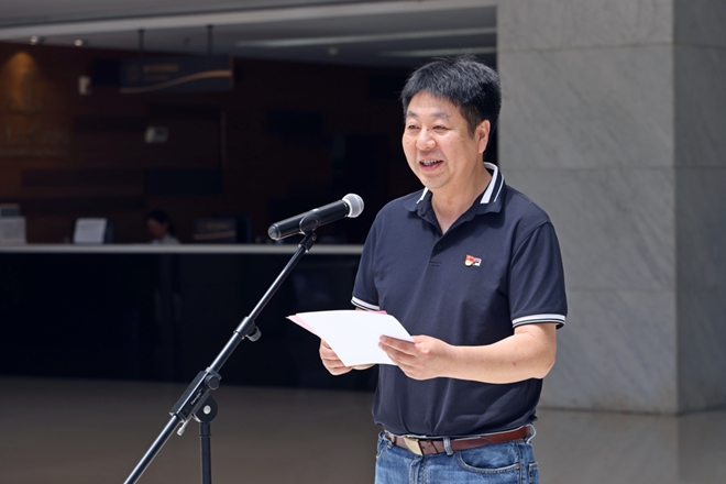 前院长、院学术委员会主任过伟敏教授作为教师代表发言,他表示在党史学习教育的热潮中,学院师生以专业所长,以手中的画笔讴歌我国在党的坚强领导下所取得的伟大成就,发出无比热爱和拥护中国共产党的心声。要通过党史学习教育的洗礼,不忘初心,砥砺前行,为早日建成国内一流学科而努力奋斗!设硕1901班的班长陈雨歌作为学生代表发言,从“初心”和“决心”两个方面表达了作为一名学生党员参展和观展的感受,和永远跟党走,坚定共筑中国梦的理想信念。