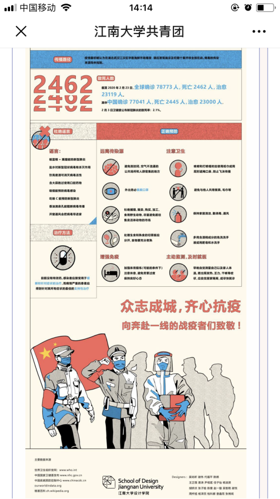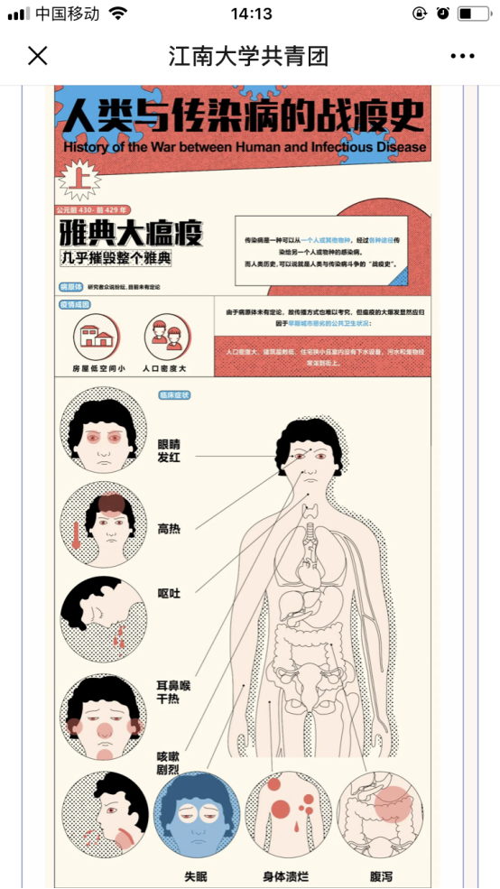 历来注重培养学生的社会责任感,希望他们能够将理论和实际相结合,学以致用,回馈社会。吴祐昕教授团队联合校团委,指导学生利用信息可视化的手段将《人类战疫史》这本书总结为十五张图片,更好的助力疫情防控宣传。这十五幅作品以时间为主线,简要概述了人类在面对重大世界性传染病时所采取的措施和逐步取得的成就。图片采取信息可视化的手段,直观明晰地展示了人类与十五大传染病的战斗历程。