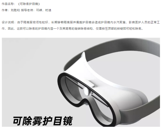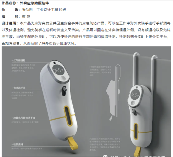 学院研究生导师团队结合专业特点,用设计快题的形式引导研究生秉承发现问题、定义设计机会、探究合理解决方案的“设计人”精神,短短数天内就完成了几十余个抗“疫”快题设计。移动生活方式设计研究实验室的曹鸣老师指导学生张劭耕等设计了《外卖应急防疫挂件》等多个作品,设计的出发点是在移动的生活方式背景下,通过造物,唤起个体防疫意识的觉醒。健康设计研究团队从问题出发,以用户需求为导向,设计了多个抗疫概念作品。邓嵘、时迪老师指导刘胜和同学设计作品《可除雾护目镜》,解决了医护人员佩戴护目镜起雾的问题。肖冬娟老师指导学生黄敬听等设计的《Disin手持式消毒器》 是一款主要针对手部及栏杆等物品进行雾化消毒的产品。