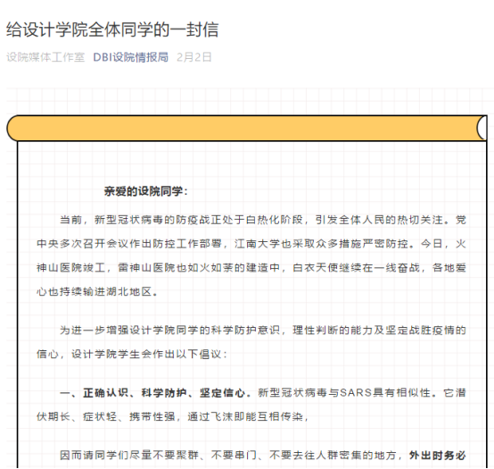 以实际行动践行习近平总书记讲话精神,决心为人民设计,为时代立传。学院发布了战“疫”宣传倡议书,号召全院师生勇于担当,和全国人民一起同舟共济,共克时艰。