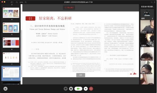 交互设计党支部组织党员精心组织开展云党课,认真学习新型冠状病毒感染肺炎相关政策文件,深刻领会习近平总书记系列讲话精神,正确认清当前疫情形势,明确设计学子肩负的时代重任,既强调居家隔离,又强调加强科研。