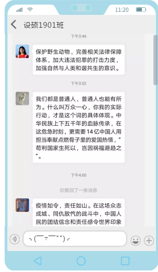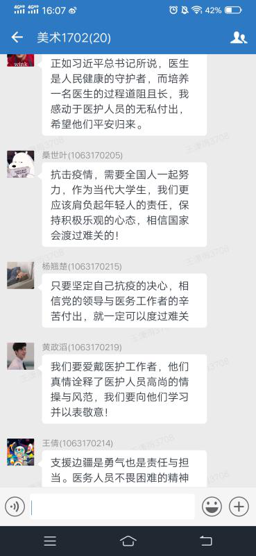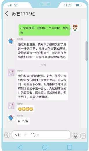 学院精心组织全体师生齐聚“云端”,通过线上集体学习、个人自学等方式收看疫情防控思政大课直播,并组织学生开展课后讨论,发表感想。同学们讨论踊跃,工设1902团支部书记韩志鹏表示“自豪,这是我在看完整个讲座后脑海中第一个浮现的词语。虽然我未曾身入前线,与千百万医护人员同生死,共命运,但这两个月中政府,以及社会群众所做出的点点滴滴是潜移默化的,这无不提醒着我,我们中国人是拧成一股绳的,我们有能力战胜并在疫情中获得未来进步的机遇。”