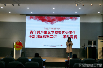 青年共产主义学校暨优秀学生干部训练营第二讲“学科竞赛能力提升”在设院一楼报告厅如期举行,主持人是贾雨睿同学。第二期我们邀请了刘聪老师和许江老师为大家讲解学科竞赛的相关政策、赛事安排、组队经验等等。