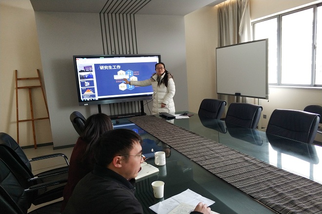 会议伊始,缪可嘉从研究生工作、团建工作及学工管理三方面进行分享。她认为,研究生工作应当以党员管理为龙头、学术活动为抓手、意识培养为依托。对于团建工作,缪可嘉指出应当确立政治高度,采用多样化手段对各个团支部进行精细化管理,作为办公室主任,她提出辅导员应该树立标准意识、预判意识、大局意识及学习意识。陆芳以学科竞赛和就业两方面工作进行分享。她首先用数据总结去年学院学科竞赛及就业的情况,其后分析就业和学科竞赛工作中目前存在的问题并提出解决方案。徐怡丽针对学风建设工作提出“一核心、二指标、三重点、四阶段、五步走”的工作思路,又以SWOT分析法解读学院目前国际交流的现状并提出“APPS”工作计划,此外,她还提出“三化三走”工作法指导年级管理工作。郑倩倩将新学期党建和评奖评优工作进行细致地梳理,对于年级管理,她认为应当坚持“规律性、准确性、时效性、严谨性、统一性”原则,密切关注学生学业和心理问题。刘聪以“以创业心态,争做新时代优秀辅导员”为主题,从国家教育政策方针及高校辅导员队伍建设等相关文件出发,提出新时代辅导员应当以创业的积极心态主动工作、主动思考,讲求执行力和满意度。周琳针对新学期资助工作及文体活动提出“一严、二学、三公、四新”的工作理念,力求实现“精准育人”。王涛围绕学生会各部门工作进行交流并提出改革学生会聘用制度、打造部门特色活动的工作计划,强调培养学生骨干政治意识、工作能力和奉献精神。