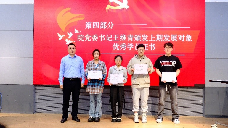 为表彰先进、树立典型,学院党委综合考量平时表现和结业成绩,按照10%的比例,在第46期发展对象培训班43人和第1期入党积极分子培训班103人中分别评选出了4名和10名优秀学员。院党委书记王维青、专职组织员陈祥洁分别为他们颁发优秀学员证书并寄语,希望他们继续努力,争当同学们的表率,不驰于空想,不骛于虚声,脚踏实地,为实现中华民族伟大复兴的中国梦贡献青春力量。