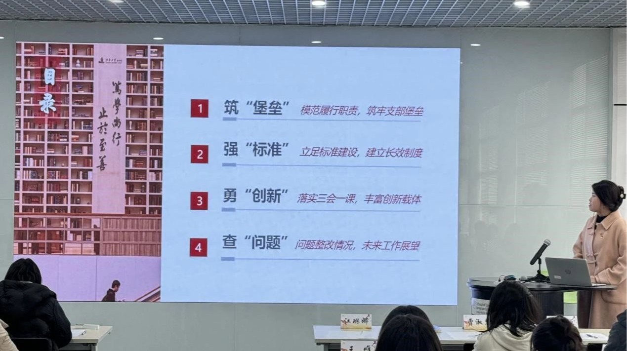 会上,各学生党支部围绕支部过去一年的基本情况、理论学习、组织建设、活动开展、支部现存问题及下一步工作思路和整改措施等展开详细述职汇报。其中,本科联合第一党支部开展 “清风正纪守初心”党纪文化作品专题设计展、“筑梦乡土研习社”、设计学子与无锡古竹“相约‘梅’好等一系列主题党日活动,推动理论学习与实践相结合;本科联合第二党支部成功举办了一系列以“严守党纪,不忘初心”主题党课为代表的党纪理论学习教育活动,不断提高党员工作的创新意识;交互设计党支部作为全国高校“百个研究生样板党支部”,发挥专业特色,打造“党团携手”的优秀做法;公共艺术与美术党支部党员充分发挥先锋模范作用,在2024年中共发表论文三篇,其中SCI收录2篇,荣获国家级学科竞赛奖10余项,省级学科竞赛20余项,实用新型专利1项,支部党员创先争优,彰显青春风采;环境设计研究生第一党支部每月开展如“重温党史光辉,担当时代使命”、“回顾党的二十大精神系列图书心得分享会”、师生党员培训会交流等支部活动,获得支部成员的一致好评;环境设计研究生第二党支部善用线上学习平台,组织专题党课、理论研讨等活动,开展了特色主题活动——“听书记讲党课”,增强党员的政治觉悟。在场13位支部书记牢记初心,不忘使命,在回顾过去一年工作成绩的同时,认真查摆问题、总结不足、提出整改方案并制定下一年的工作计划,充分展现了各支部积极向上的精神面貌和严谨认真的工作态度,以及 “一支部一特色”的建设成果和“我为师生办实事”的先进举措。