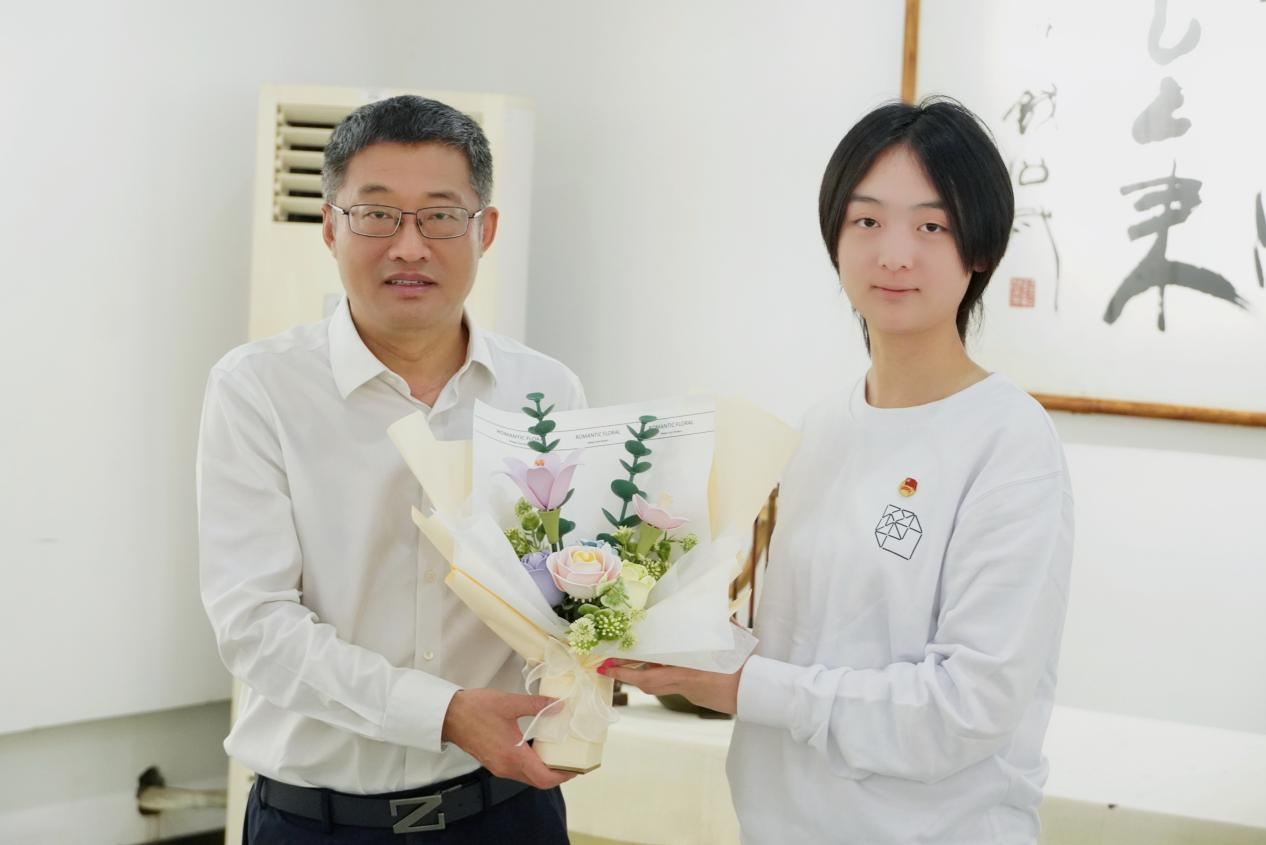 随后进入“青春奋斗说:升学路上的青春担当”环节。糜子舒同学以《奋楫青春路·升学向未来——设计青年的强国答卷》为题,进行了专题汇报。她用扎实的数据和鲜活的案例,展现了设计学子心怀“国之大者”的精神风貌和实际行动,彰显了新时代设计青年在升学征途中的责任担当。紧接着,张启楠同学分享了其对学长学姐升学问题的采访调研成果,梳理了往届生在升学准备、心态调整等方面的经验与困惑,为同学们提供了实用参考。随后,优秀毕业生代表高琦同学结合自身经历,分享了宝贵的考研心得,并向校长赠送花束。