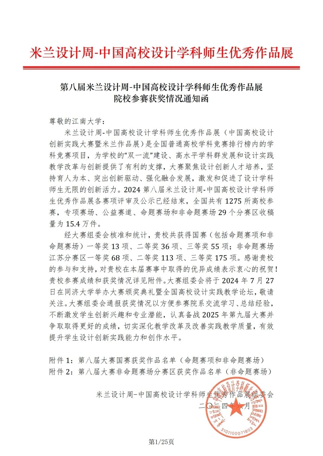 近日,由中国教育国际交流协会、中国高等教育学会联合主办,中国教育国际交流协会承办的第八届“米兰设计周——中国高校设计学科师生优秀作品展”国赛获奖名单正式公布。江南大学设计学子的参赛作品脱颖而出,成功斩获国家级一等奖13项,二等奖36项,三等奖55项;省级一等奖68项,二等奖113项,三等奖175项,实现了在该项赛[…]