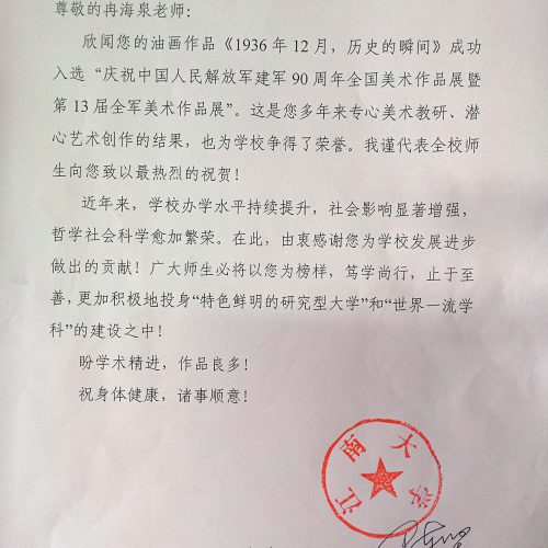 了解详情>>校长陈坚祝贺非凡娱乐 冉海泉副教授作品入选“庆祝中国人民解放军建军90周年全国美术作品展暨第13届全军美术作品展”